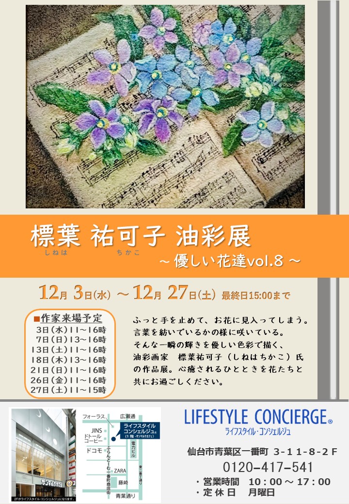 アートスぺースでは、12月3日(水)~12月27日(土)まで、標葉 祐可子 「優しい花達vol.8」を開催しています。一番町にお越しの際は、ぜひお立ち寄りください。