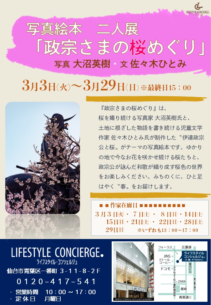 アートスぺースでは、2026年3月3日(火)~3月29日(日)まで、写真絵本 二人展「政宗さまの桜めぐり」写真 大沼英樹・文 佐々木ひとみを開催しています。一番町にお越しの際は、ぜひお立ち寄りください。